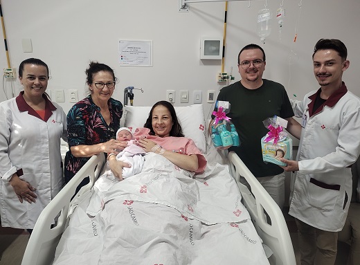 Para celebrar o nascimento de Cecília, a família recebeu um kit com produtos para o enxoval da criança. A ação, realizada anualmente pelo HBST, ocorreu em parceria com a Farmácia Equilíbrio, de Encantado, e contou com a participação do proprietário da farmácia, Henrique Gheno.